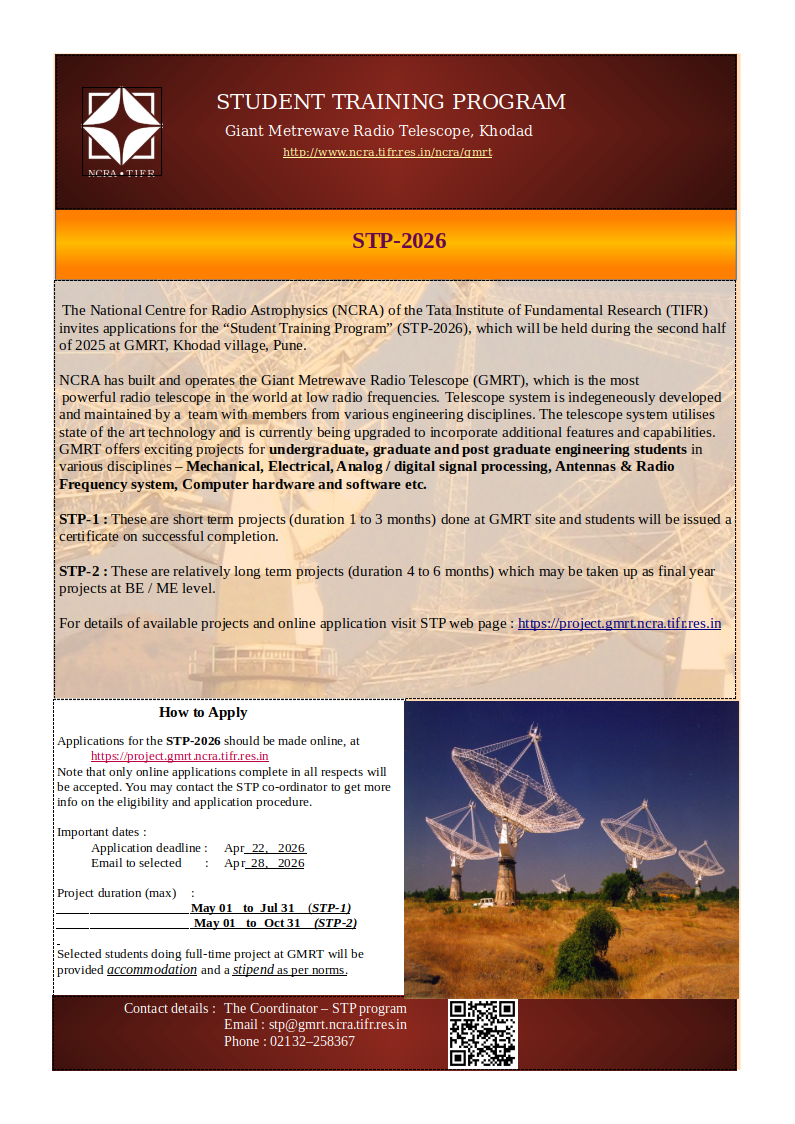 At GMRT centre Khodad, we are working on the design & development of improved modules for various sub-systems of the telescope. This involves various aspects of engineering and over the years we have found that many colleges in Pune and nearby districts have shown interest in the work we do and have enquired about possibility of allowing their students to do engineering projects at GMRT centre. In order to regularise the student projects and make it a formal arrangement similar to the Visiting Students Research Program (VSRP) at NCRA A formal STP program is being introduced from July 2023.